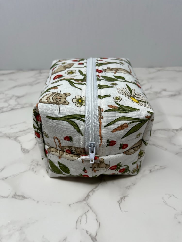 Carefully crafted from 100% cotton fabric backed by a layer of fleece and fully lined for durability and a clean finish. The zipper closure keeps your items secure, while the boxy shape maximizes storage space without taking up too much room in your bag or suitcase.