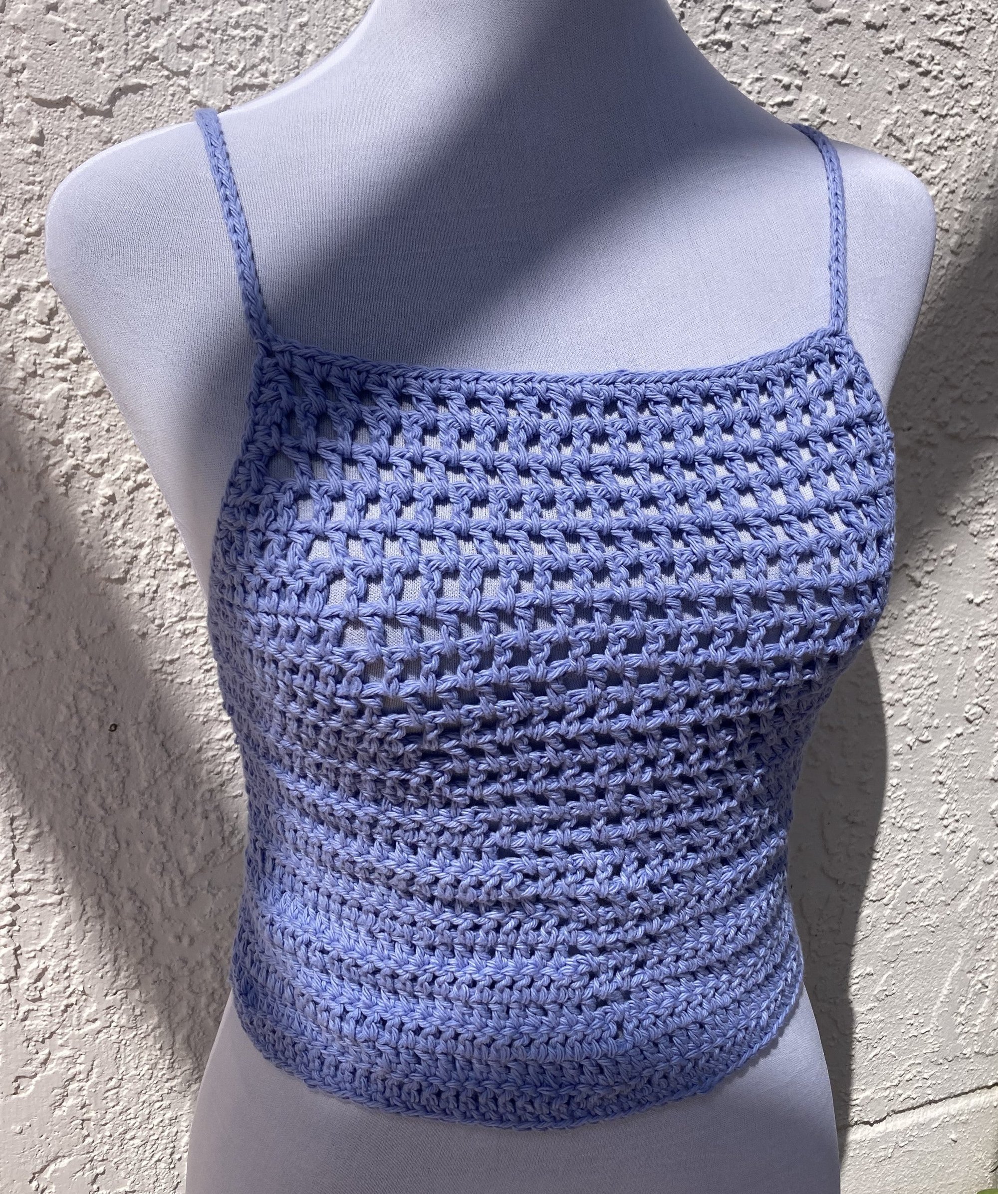 100% Cotton handmade crochet crop top with mesh detail.