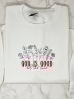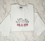 This God is Good Embroidered Crew Neck Sweatshirt is a versatile addition to your wardrobe, perfect for casual occasions.