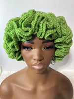 Hand crocheted beanie with a dramatic ruffled brim.
