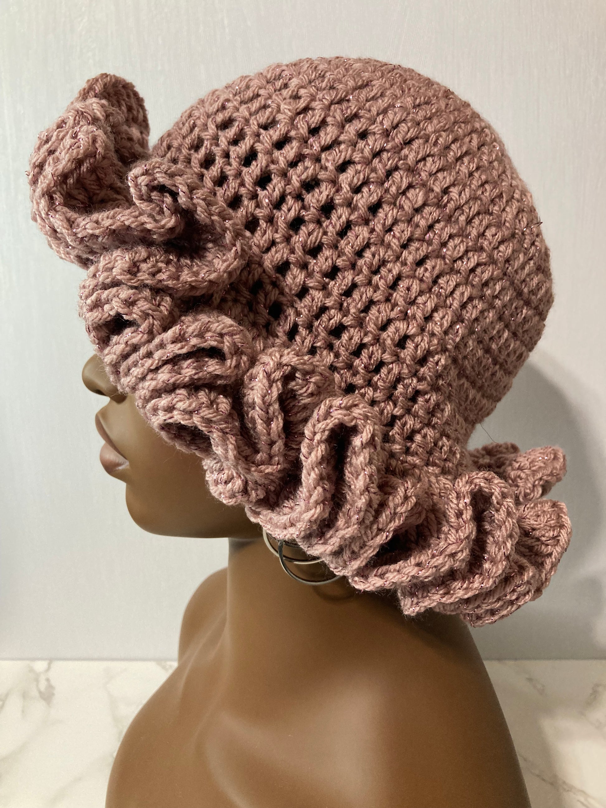 Hand crocheted beanie with a dramatic ruffled brim.
